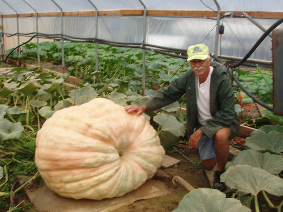 I had the privilege of visiting John Wayne Brooks' patch today. He has some very nice pumpkins going. This one is taping at 659 lbs, grown from a 1085 Van Hook. It was started in the greenhouse, but the majority of the plant is growing outside of the greenhouse. John has lost some nice pumpkins in the past, but he's a tough old bird and keeps picking himself up, dusting himself off and jumping back in for more. He has grown some nice pumpkins and watermelons in the past, but is especially known for his squash. He has won the Allardt squash competition 4 times.