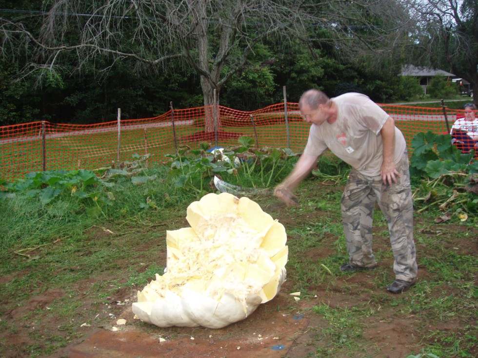 The 1149 developed about a two foot long split after an unexpected large rain. It did not go through to the cavity, but I decided to cut it up and weigh it piece by piece. The total came to 841 lbs. It's a hollow feeling to baby her all season and not get her to an official scale, but I did enjoy the process of growing this pumpkin this year.