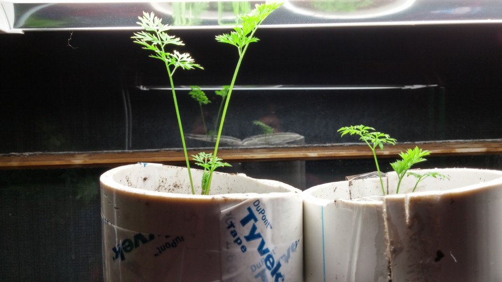 Carrots looking good under the lights! These things will take all the light you can give them. I forgot to turn the light on one day before leaving for work only to come home to a couple of droopy carrots!