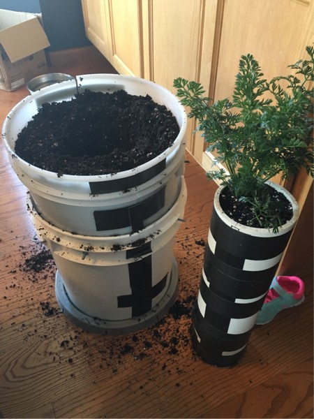 Decided to up pot my best carrot. Made a new pot/tube from 2 five gallon buckets. Cut the bottoms out of each bucket and used a lid for the bottom. I used the exact same premise as the smaller tubes just on a larger scale.