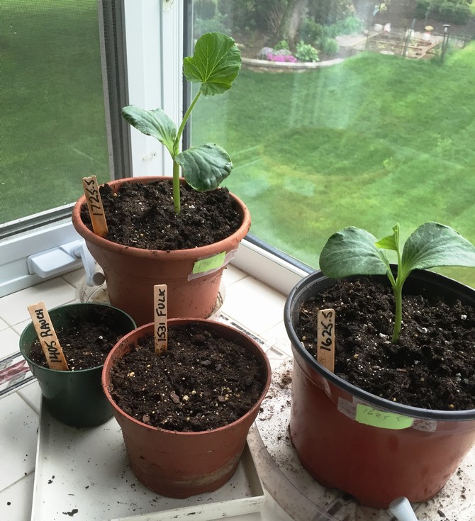 Decided to move the 2 sprouted seedlings and 2 of the newly planted seeds out of the heated indoor greenhouse to a southern bay window. The seedlings were growing too fast and 5 of the original 7 seeds failed to sprout in the greenhouse, leave 5 original (now 10 days in the pots) and 2 newly planted seeds (4 days in the pots) in the greenhouse. Repotted seedlings deeper into larger pots. Weather terrible - 45-52 deg and misty rain last 2 days and predicted for rest of the week. Nuts - really wanted to move the seedlings to the cold frame in the patch before they get too leggy.