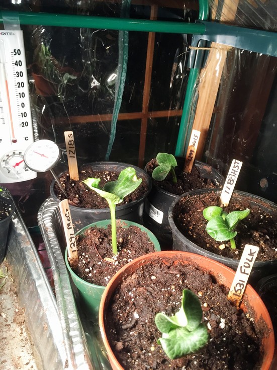 Success with minimalist seed treatment. Just soaked for 8 hours in tap water, cut distal half seed edges and planted in Miracle Grow potting soil with some mycrochizia and kept air and soil at 70-72 deg. None of this soaking in sea weed solution, or baking 88 degree air where only germinated 2 out of 7. Now have a team of 6 and so the season is assured! Still cold and rainy, but expect first sun in 8 days Sunday - then the first and best seedling goes to the cold frame. Testing cold frame with a pepper plant and spaghetti squash at 60-75 deg air and soil temp up to 62 deg with black plastic. Both plants thriving, so in goes the 1725 Haist '14, already 10" after repotting into a deeper pot last week.