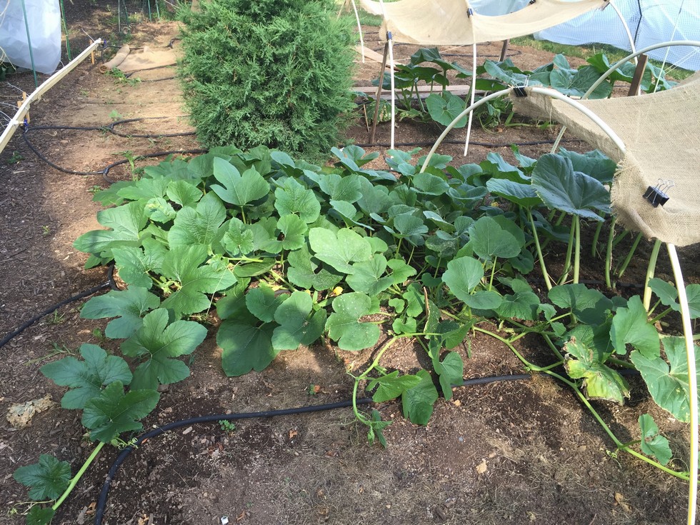 The spaghetti squash originally placed in the cold frame in Early May to test growth conditions has carried on with a free ride to the point of taking over the place. His days are numbered