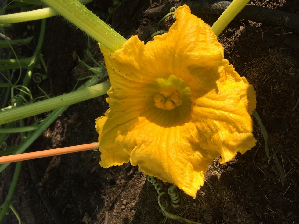 First candidate has 4 symmetrical units - rather have 6 but take what we can get to get started. Best part is that this fruit is on the main vine, not a secondary. Most of the secondaries emerging from 8' and further down the main vine have tiny female flowers near their growing tips. Clipping off tertiary in earnest now.