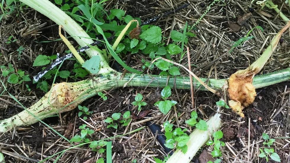 Oh Oh - looks like vine borer on the Fulk 1531 I look at this vine every day and didn't see a hint of borer until this and it appears already crippling. Attacked with Direct application of Bonide "Eight" and Raid Ant and Roach killer. Nuts