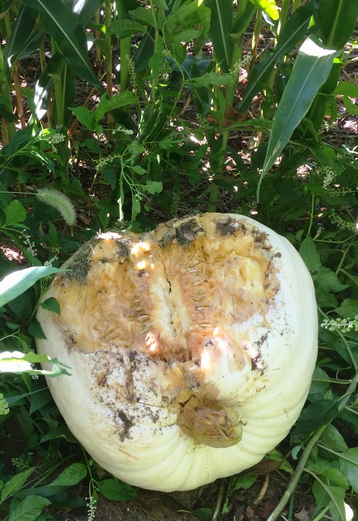 First Fatality - Filbert, stalling at 138 lbs. Today noticed a wedge of discoloration and softness arising from the ground up to the flower stub. Turned it over and found this. My own fault - this was the only pumpkin lying right on the ground without matting or anything. The cost of bad judgement. Won't happen again. What they say? "Good judgement is based on experience, and experience is based on bad judgement" So chalk up some more experience. Remaining Players (est weights) 1531Fulk: Duke 434 1725Haist Gilbert 228 Festus 214 Fred 164 Wilbert 157 Angelina 76 Peaches 44 1969Haist Max 187