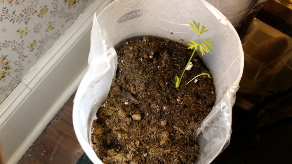 Carrots are doing okay 2 weeks out aprox this is 1 of 2 i got going other 3 died after a cold night lol