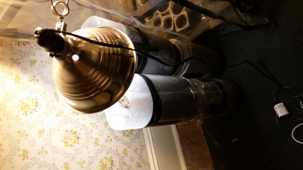 This is my light to keep them warm in another week ill be able to put back in greenhouse under 125 watt hps but dont want to cook them plus its filled with hot peppers and i finally got a mater to sprout thank god , sitting home with a pulled tendon in my thumb is not helping eithor ggrrr....