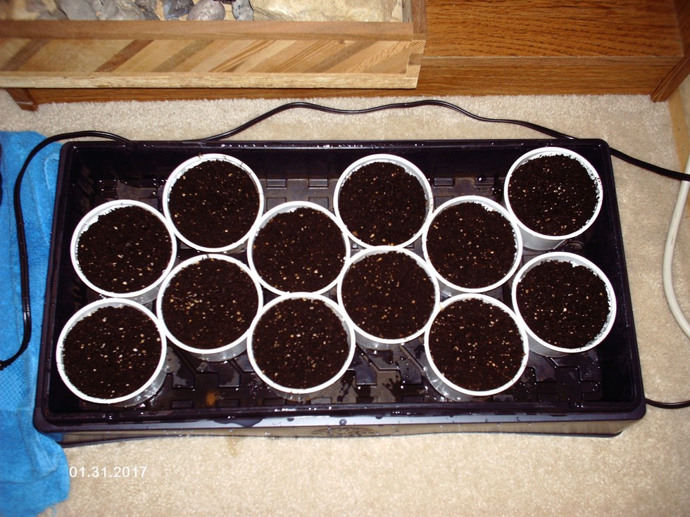 I took this photo today, but the planting for the seed tray without the blue towel was planted on Sunday, January 29th. On that day, I planted Trinidad yellow scorpion peppers (Garofano 2016), World Record Strain giant green bell peppers (Nieuwenhoff) and Sweet Banana Peppers. Thank you exotic seed exchange 2016!!