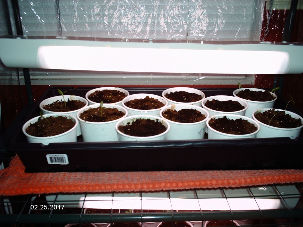 The wind is howling outside!! Update on progress: On the left of this tray, I am now showing 4 World Record Strain Giant Bell Pepper seedlings from 550g Nieuwenhoff! The fourth sprouted this morning!! In the middle, I have planted six Ghost Pepper seeds from Oglesby 2016 and some began sprouting this afternoon!! These require a great amount of heat. On the right, the two cups with all four Trinidad Scorpion Morouga Yellow peppers from Garofano 2016 have been previously separated and doing very well. I am so excited to receive so many wonderful seeds from the Exotic Seed Exchange this year!!