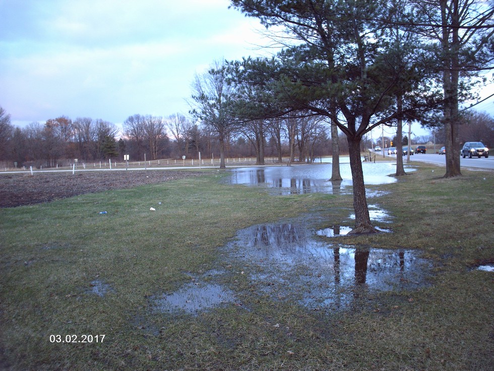 Lack of drainage at the Fox Valley Park District community garden plots often results in standing water. Runoff is restricted to this area due to lack of access to two retention basins (wet and dry) just south of 5th Avenue. The risers for both are clogged with sediment and vegetation due to lack of maintenance.