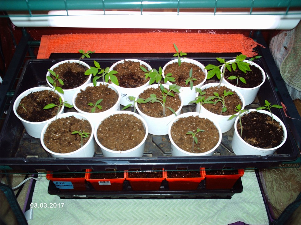 Update on progress: Lemon Globe indeterminant tomato seeds, Chilean Red Flat Bush Beef determinant tomato seeds, and Purple Cherokee determinant seeds are all doing well. These will need to be deeply transplanted into new pots.