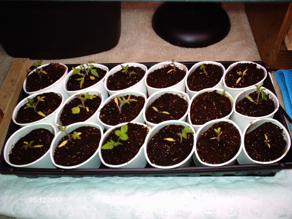 Bush Beef determinant seedlings are progressing, but started showing some yellowing. I stopped feeding and transplanted all into new separate pots.
