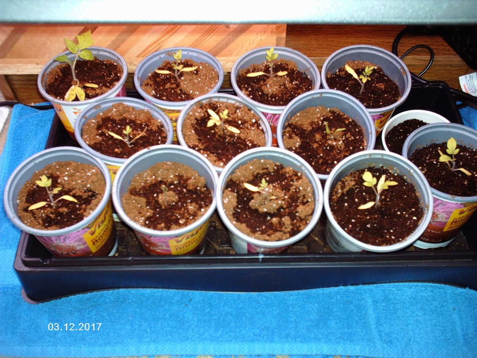 San Marzano determinant seedlings are progressing, but also started showing some yellowing. I stopped feeding and transplanted all into new separate pots.