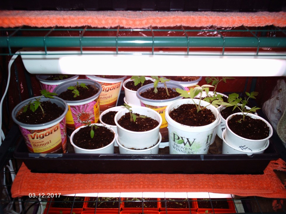 Update on progress: Lemon Globe indeterminant tomato seedlings, Chilean Red Flat Bush Beef determinant tomato seedlings, and Purple Cherokee determinant seedlings are all doing well. These were transplanted yesterday into new pots.