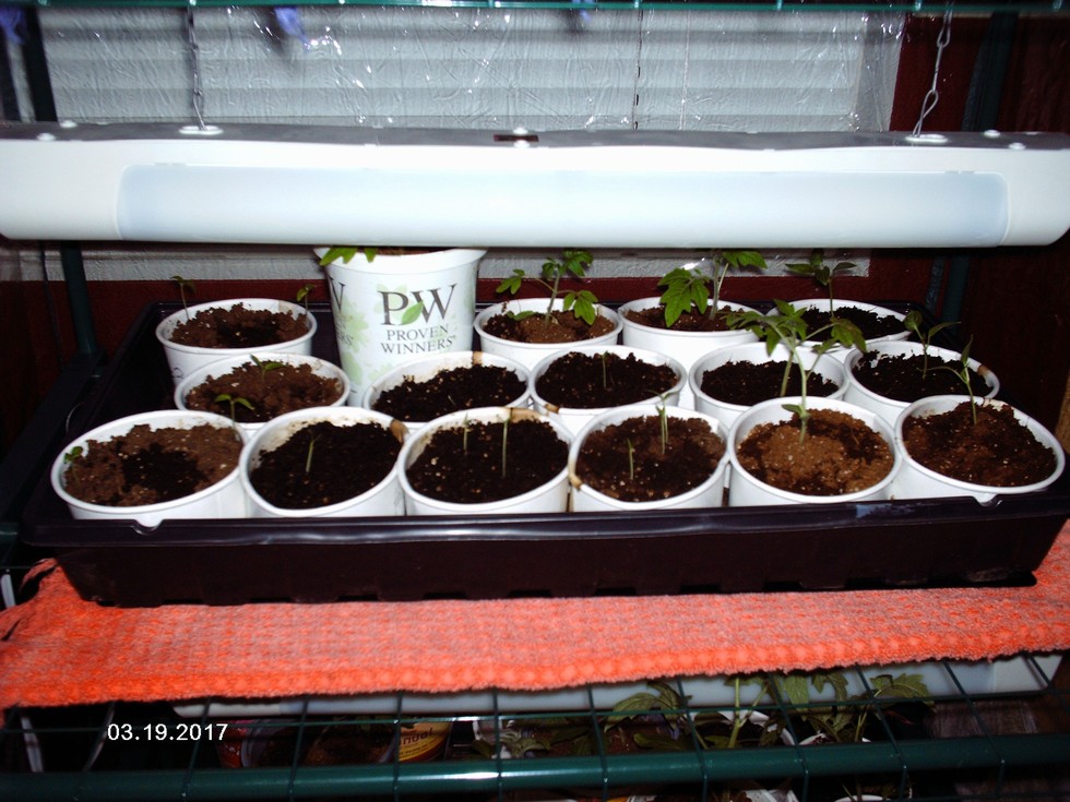 The weather is warm at 62 degrees F which may break a record at 79 with a strong southerly wind!! Thunderstorms tonight with rain through Monday! Update on progress: Tray is showing now 3 World Record Strain Giant Bell Pepper seedlings from 550g Nieuwenhoff. I have one Ghost Pepper seedling from Oglesby 2016. I have new Carolina Repear seedlings in new pots, but whoever donated those to the Exotic seed exchange never included more than a name of the seed. The grower's name and year grown were missing from the package! The two cups with all four Trinidad Scorpion Morouga Yellow peppers from Garofano 2016 are doing very well. Some of my tomato transplants are also taking space in the tray.