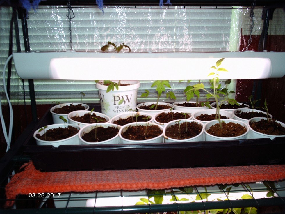 The weather is cool and damp at 57 degrees F with lots of clouds and rain on and off. Update on progress: Tray is showing now 3 World Record Strain Giant Bell Pepper seedlings from 550g Nieuwenhoff. They are taking off on the right. I have one Ghost Pepper seedling from Oglesby 2016. Waiting for a new leaf set. I have new Carolina Repear seedlings in new pots and they seem to be doing okay. The two cups with all four Trinidad Scorpion Morouga Yellow peppers from Garofano 2016 are doing very well. Some of my tomato transplants are also taking space in the tray and appear to have a love affair with the grow light!!
