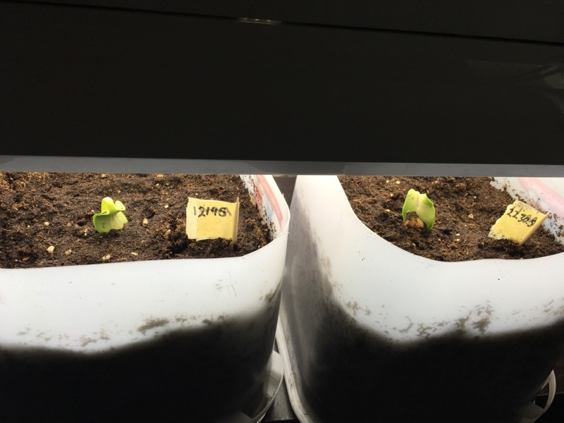 4 days after planting. 2145 McMullen and the 2230.5 Wallace are up. The light is bright enough to shine right through the tape label. My 1684 is a few hours behind. I err on the side of dryness for soil moisture. It doesn't take much more than damp soil to rot a seed. It does take a bit longer to germinate if the soil is a little dry.