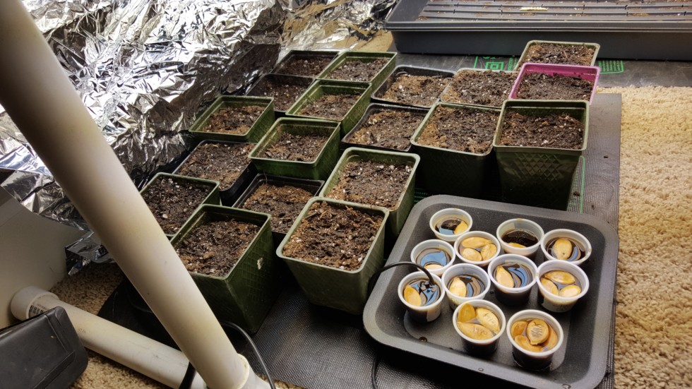 The seeds are soaking for 8 hours in a weak kelp/ humic mixture while the 4" pots warm up. First thing in the morning the seeds will get planted! I'm gazing upon them dreaming of 2000-pounders and Half Moon Bay....