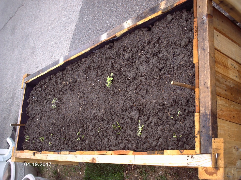 Today, I transplanted (L2R) Arugula, Butter Crunch Lettuce, Spinach, Swiss Chard, Spanish Onions Arugula, Green Leaf Lettuce, Spinach, Butter Crunch Lettuce and Swiss Chard. In the next row between the wood stakes, I planted Heirloom Sugar Daddy Peas. Next to the peas, I transplanted Curly Kale, Vates Collards between the two Kale and French Dressing Radishes to the either sides of the Kale. This planter has layers of garden soil, composted aged horse manure, raw kitchen scraps (no dairy, citrus or meat), shredded b/w newspaper, shredded card board, over wintered 22 gallon totes of decomposed giant pumpkin, squash and kitchen scraps and 1 1/2 c. Burpee Organics Tomato and Vegetable Granular Slow release fertilizer. The fertilizer was worked into the soil prior to planting and watering the soil surface. Temperature outside is 67 degrees F, winds are light at 1 mph from the north, mostly cloudy, RH 71%, BP 30", visibility is 9 miles, Dew point Temp is 57 degrees F, sunrise at 6:06 am and sunset at 7:38 pm. Planting is very early considering page 248 of the 2017 Old Farmer's Almanac by the moon's phase for my area (3), so I will be closely watching these transplants. I have backups since this is my first time. I am expecting the temperature in the raised beds to be higher than when planted in level ground.