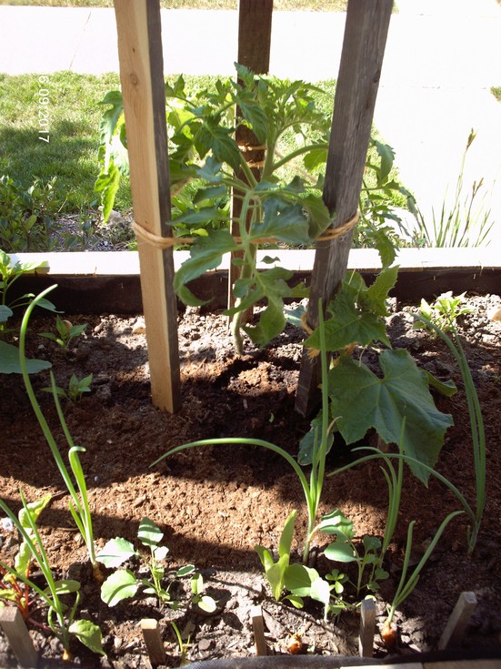 This is a Lemon Boy indeterminant transplant from saved seeds. Note the leaf shape which is quite different from the determinant varieties which are more pointed. I have also purposely paired companions such as the space saving cuke to aide in pest control and nutrient uptake. Following the initial starter packets from Ron, I will be feeding on the 11th around the bases of the plants an organic food also found on the Wow Wallace website. Look for the pics to come!!