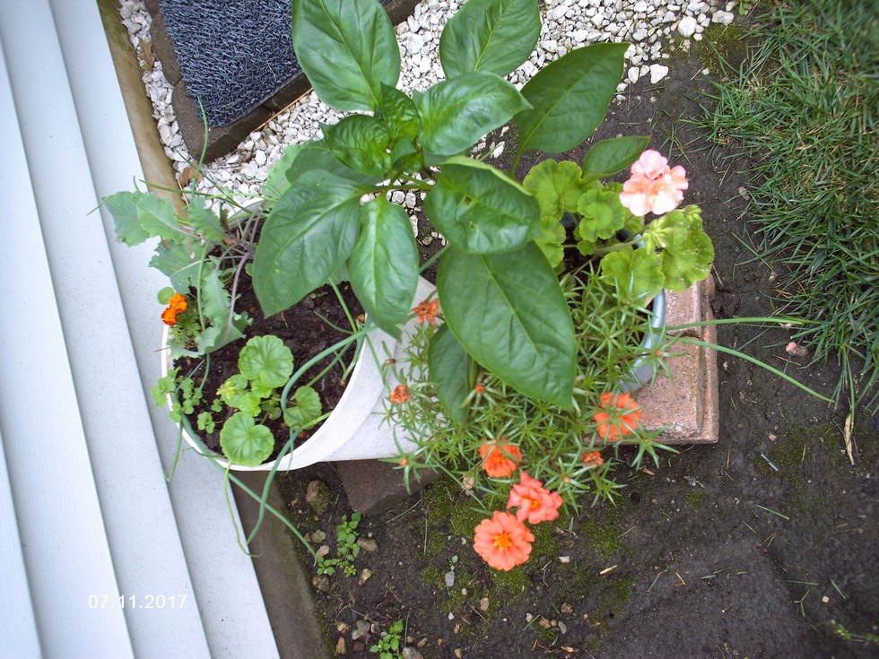 Pepper and flowers are doing well by the back door. Tried planting purple kale for the first time!
