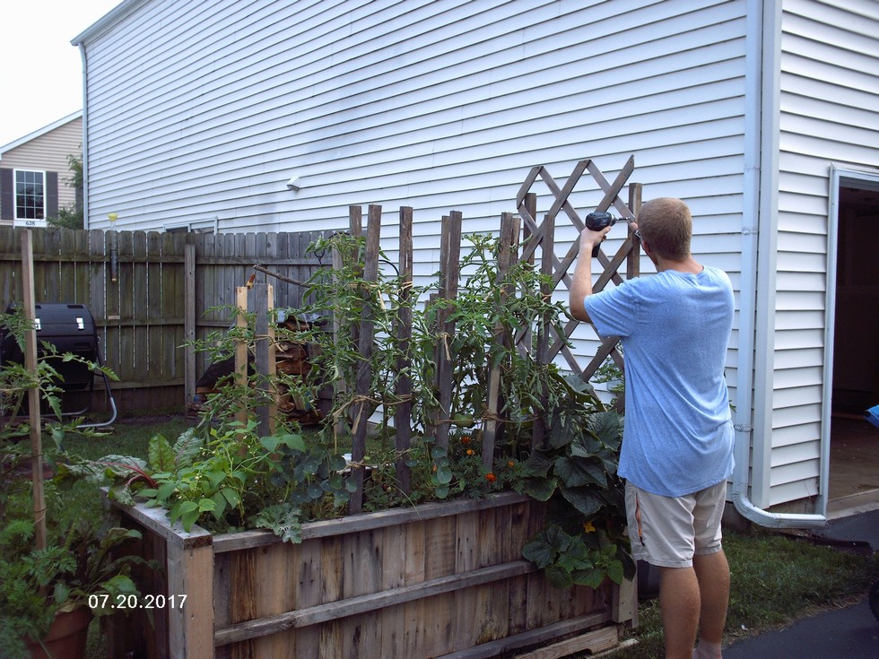 My son, Christopher, putting up the trellis. So nice and thanks Mr C!!!