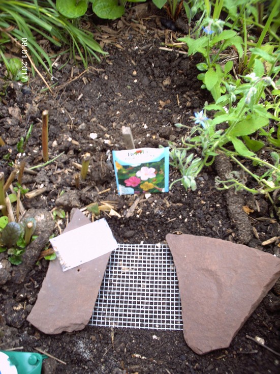 Here are two planting areas prepared for more seeds. At the top of the photo, I planted 4 o'clocks and at the bottom, I planted the scarlet runner bean. Yes, RODENT, I especially thought you would like to try digging into the 1/4" welded wire fabric!! I thought of you - HOW SWEET! How kind of you last time around to leave my fully sprouted scarlet runner bean exposed to the hot sun on the soil surface!!