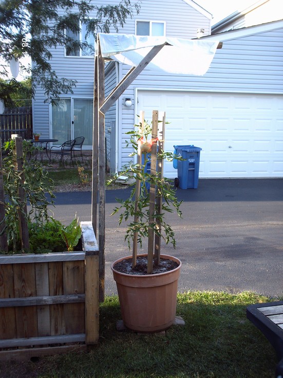 Lower left corner shows the entrance of my "best friend" chippy! She is responsible for digging up most of the young onions and garlic and occasionally stealing random planting of seeds. This is her summer hang out since we apparently disturbed her winter residence in our woodpile for our fire pit. In the pic, Christopher set up a shade shelter for the backyard 4.53 Wixom. I now have twin fruits packing on some weight. The white stuff you see on the soil surface of the planter is to distract my "best friend" from her constant habit of digging! Smells just like peppermint. I hope she likes the fact that I thought her too before I planted my new seedlings! Where's that trap for that rodent??