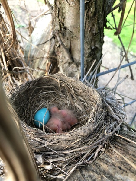 Momma bird almost took my head off when I tried to pull the vines away...there�s three of them there...I named them Christopher, Qtip, and Qualley ....the blue one is Qtip...