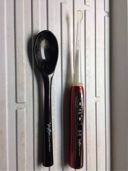 On the right is a Vegibee for vibrating the blossoms & on the left a black spoon with pollen collected on it.