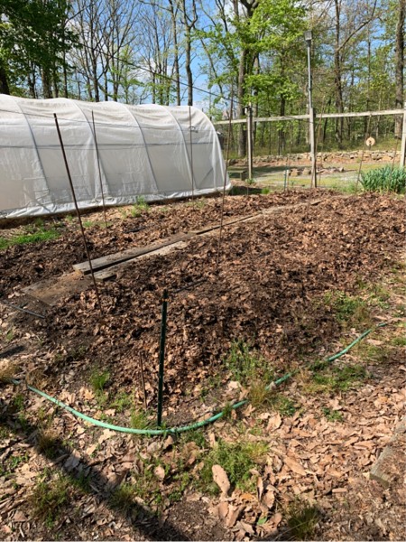 Leaf mold mulch is now in place. Never leave the soil bare. Drip system is under the mulch. Next will come the tomato support system. In about a week I will pull back some of the mulch where the plants will go. It has not rained for over a week.