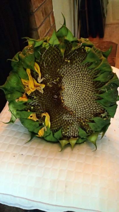 The sunflower head is now being used a living room decoration while it dries. Not that I really use my living room as a living room. It's mostly a storage area for my growing supplies, lol!
