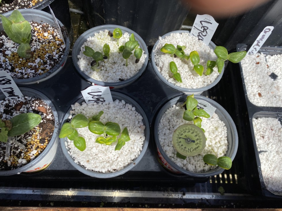 Here are some legacy seedlings germinated under intermittent mist in pure perlite. Notice the soil thermometer a must for germinating seeds. Mine is just a cheap meat thermometer to check your meat after it is removed from the oven or grill. I got it at my local hardware store for a few bucks.