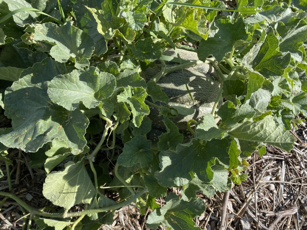 56.2english tucked away under some leaves. This is my first time growing a giant cantaloupe. I am not counting last years failure. I definitely could have put this thing in A better spot and given it better care. We will see how it does. it has to be close to getting ripe now