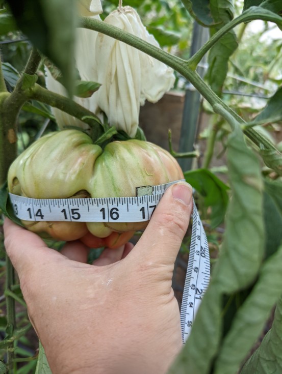 The lower tomato on the Lyons plant is blushing. It never really took off and just grew slowly.