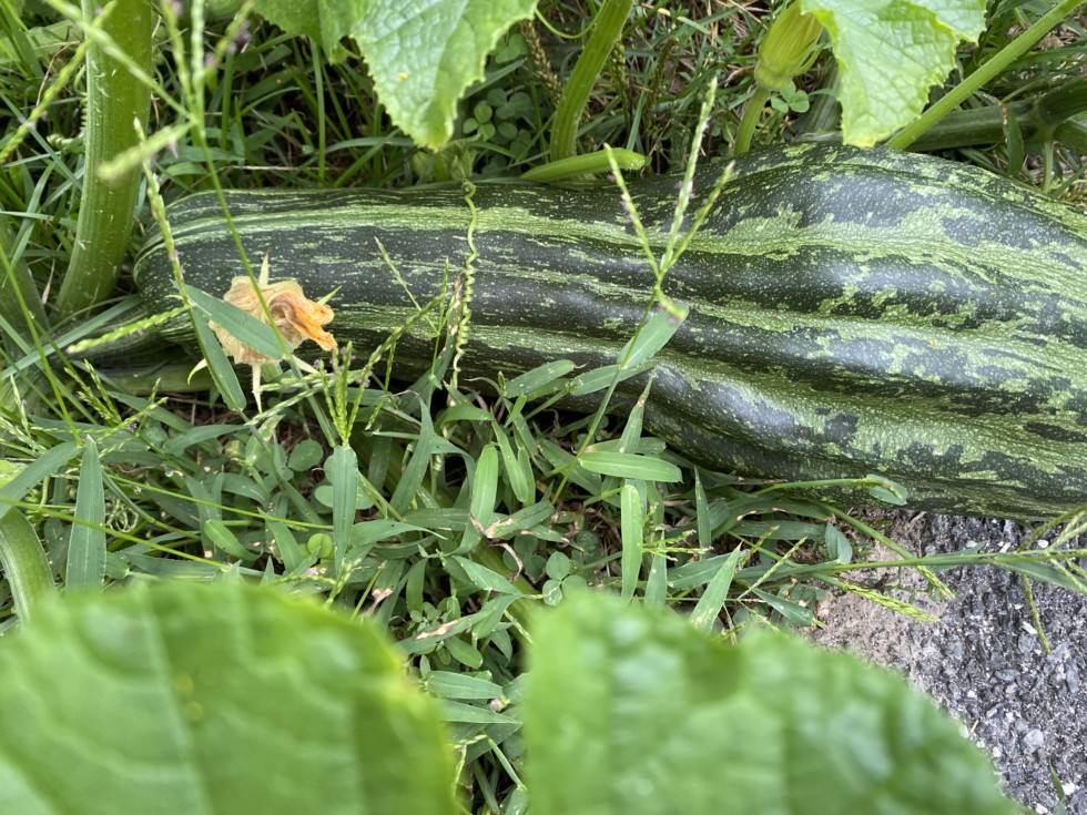 This volunteer looks like a cross between a zucchini and an acorn squash. There are lots of different vegetables that are of the species cucurbita pepo. Therefore you will almost always see these types of crosses