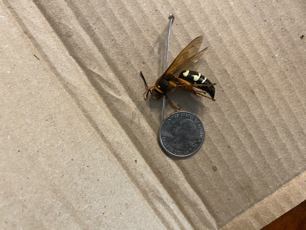 Cicada killer wasp, these are huge. they are a solitary bee that lives in a burrow that it makes in the ground. They eat cicadas and like sandy soil to build their nest in.
