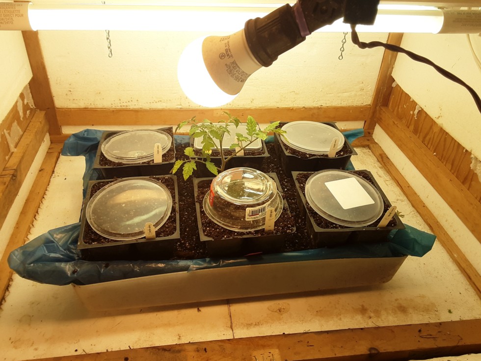 There's a volunteer cherry tomato (I pulled out of the cilantro) in the middle of the sunflowers. It will be a companion plant for the sunflowers. 24 tomatoes, of which only 4 will get a spot in the mini grow hut.