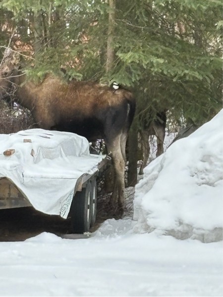 A couple of moose are browsing on tops of the branches of a birch tree I took down , if you look close , a magpie has landed on his back,just for fun