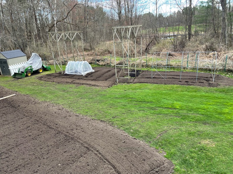 The old patch is slowly getting there but is a little wetter than the big patch. One pumpkin will go in the 400 square foot space. We also have 2 trellises that are 14.5 feet tall and a larger hoop house that will hold giant tomatoes. The goal for pumpkins to be planted out is May 1st and the long gourds and tomatoes will be mid to late May.