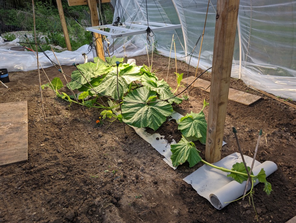 The 1832.5 outgrew the mini greenhouse so it was removed to give it the space of the bigger greenhouse. The main vine is just over 7ft long and I think the secondaries are the most advanced I've had at this main vine length. I put some end walls up within the big greenhouse, but not taking the full length yet. The greenhouse is 24ft long and the walls currently give 16ft in length. The plant is on a 17:7 light cycle (off at 10pm, on at 5am) and co2 is given to 1200ppm whenever the greenhouse can be closed. However it has to stay open most of the day due to high temp and humidity. The co2 and lights are working out so far.