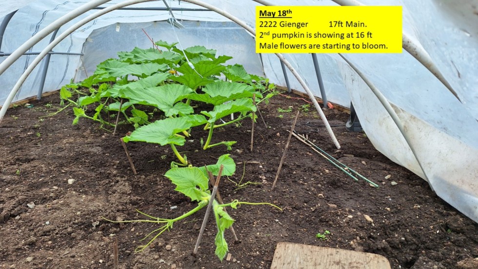 The 2222 is showing a pumpkin at 16 ft. Total length of main is 17 ft. Starting to see male flowers blooming. One is showing in this photo.