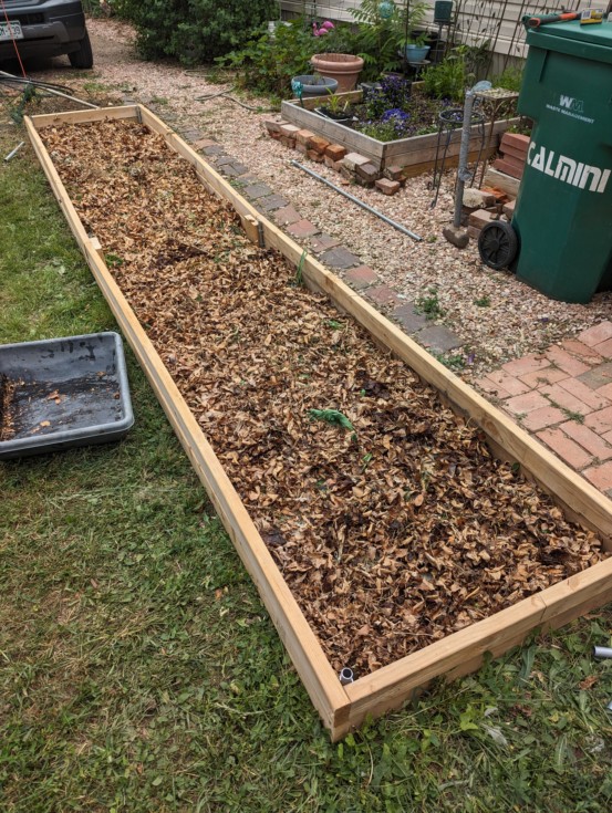 Another day of work on the raised box. Layer of sand then a layer of half decomposed leaves.