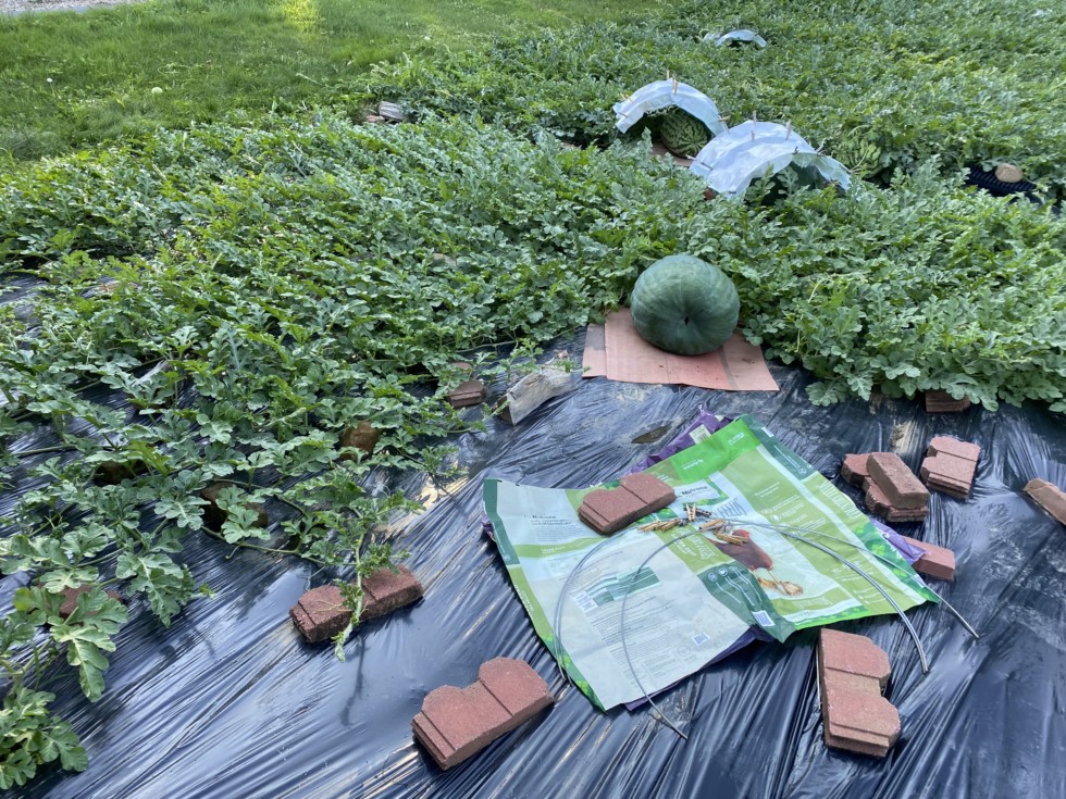 In this photo, you can see that this plant has been stunted by these two actively growing melons. It is the only plant that isn't overflowing. It's alloted space. I really do like to get the melons to set early on a small plant. This can help limit plant size somewhat and hopefully reduce crown size and graft incompatibility problems.