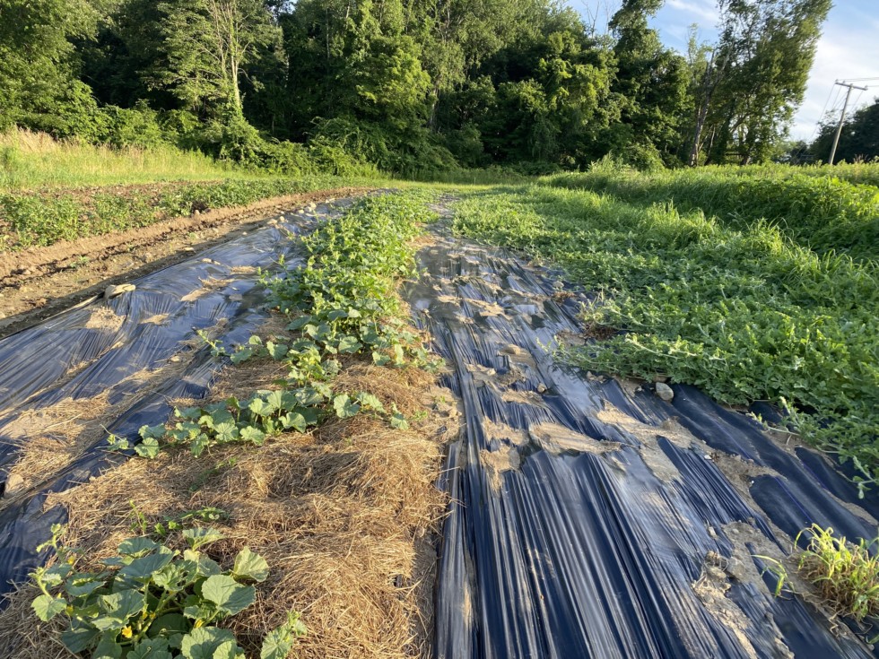 A row of cantaloupes, they are also known as muskmelons. A muskmelon is an eastern version of a western cantaloupe. (the type what you would find in the supermarket) Often a muskmelon would have ribbing and a very strong perfume or musk scent. When I was younger we would sell "Muskmelons" on my aunt and uncle's vegetable stand and that's what we called them. I don't know if people today still use that term. I think it's a word that's about to become extinct.