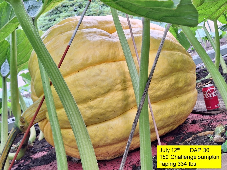 My little 150 Challenge pumpkin has reached DAP 30. Taping 334 lbs. Starting to outgrow much of its gnarly surface.