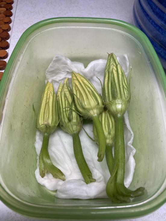 Since, everyone seems to have a different opinion regarding how long male flowers/pollen is viable and because at least one experienced grower believes it can be viable to at least 4 days, I decided to do a controlled experiment. On Wed. July 10th, I picked a few male flowers that looked like they would open the next day. I placed the flowers in a plastic container on a damp paper towel, put the top on and stuck them on the middle shelf of the fridge. On Sat. July 13th, I took the flowers out of the fridge, placed them in room temp. water, covered them with an insect proof bag, then set them on the front porch to let them get to ambient temperature. Three of them appeared to be more open than the others and I suspect if I had set them in direct sun, they might have opened fully. Two hours later I used all of them to pollinate a pumpkin on my 150 plant that I had covered with an insect proof bag two days before. So, 3 overnights in the fridge. We'll see what happens