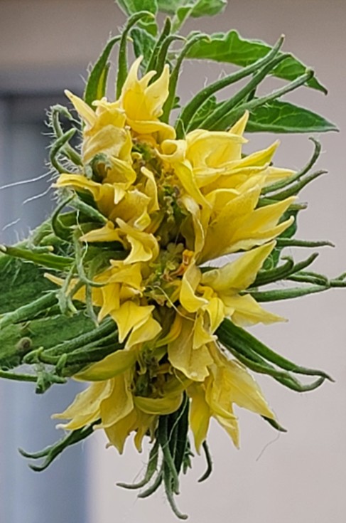 Here's that same upper-deck ribbon bloom on the 9.06, petals starting to fade. I'll be able to tell shortly what's hidden beneath that birds nest. Truth be told, the ribbon stem is ~3/4" wide, but VERY thin. I'd be quite surprised if the stem/pedicel could keep up with the needs of the fruit.