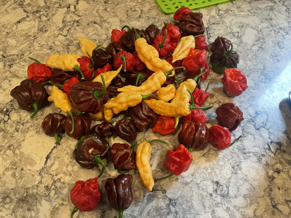 Hot peppers are doing great. Carolina reapers, chocolate scotch bonnets, and Jay's peach ghost scorpion.